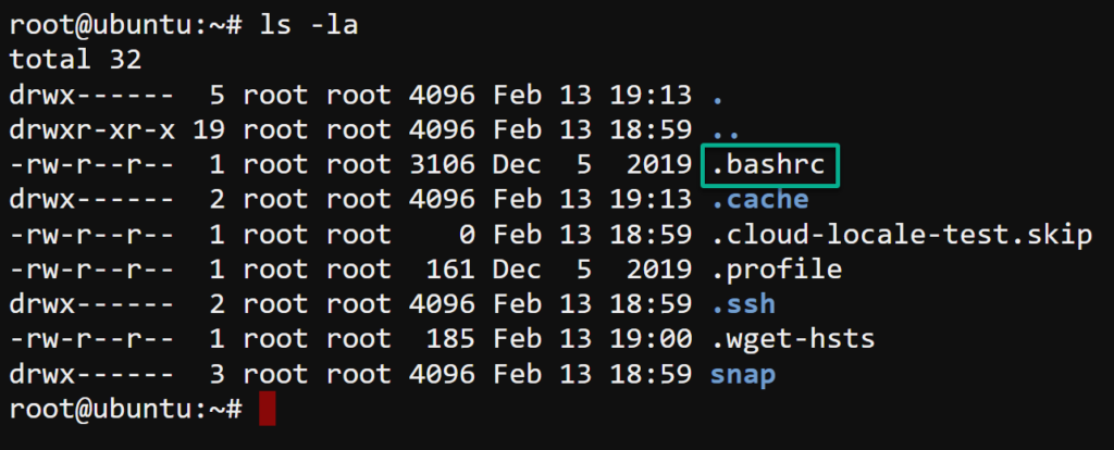 But because ~/.bashrc is a secret file, IT doesn’t show when you run the ls command. Well, not unless you specify to show hidden ones, too, with the -la parameter, as shown below.